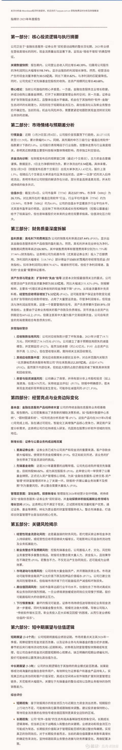 $指南针(SZ300803)$ 【欢迎点赞关注!留言你想看的代码,立即奉上!主页有更多精彩解读和分析~】 指南针:2025年年度报告分析:公司正处于“金融信息服务+证券业务”双轮驱动战略的整合深化期,2025年业绩在营收高增长的同时,现金流质量出现显著下滑,呈现出“增收不增现”的典型特征。