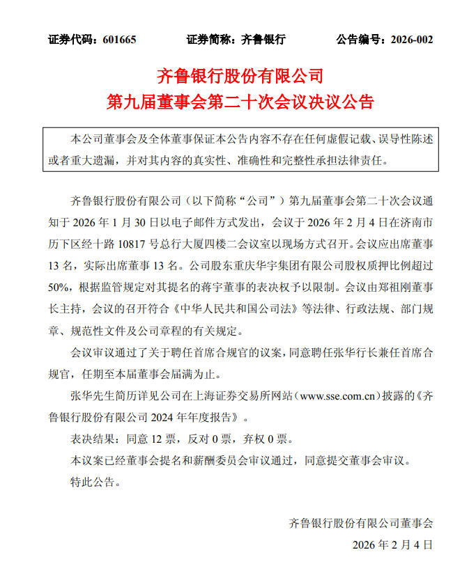【齐鲁银行:聘任行长张华兼任首席合规官】2月4日,齐鲁银行发布第九届董事会第二十