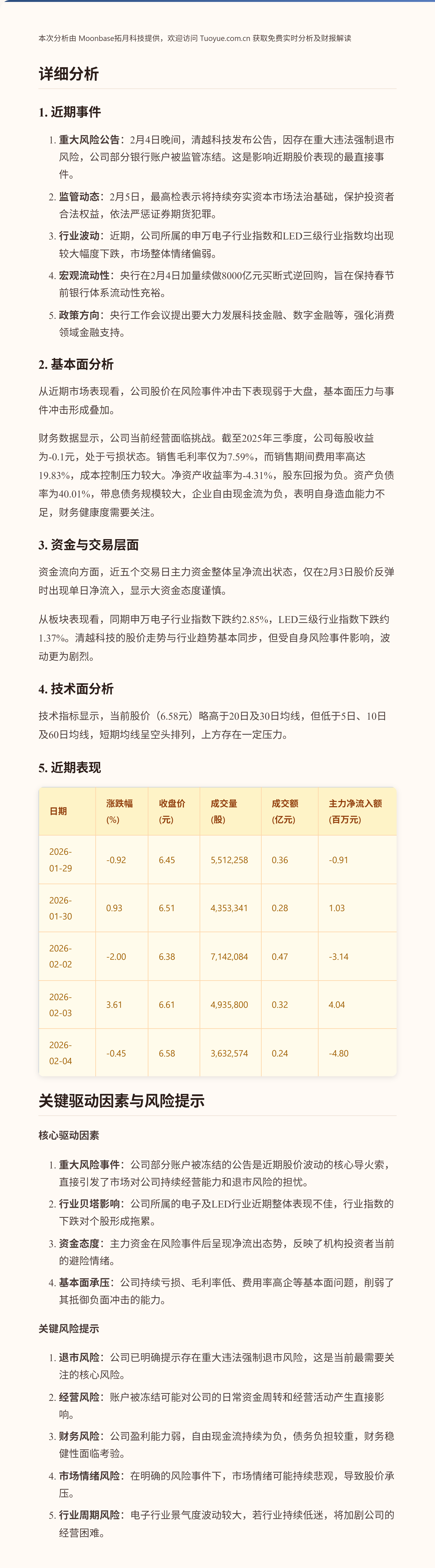 清越科技近期股价在6.4元附近震荡,五个交易日累计小幅下跌。股价波动主要受到公司层面重大风险事件的影响,2月4日晚间公告显示公司部分账户因重大违法强制退市风险被冻结。同期,所属的电子及LED行业指数也经历了较大幅度的波动,市场情绪较为谨慎。