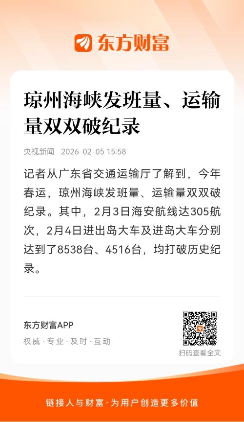 记者从广东省交通运输厅了解到,今年春运,琼州海峡发班量、运输量双双破纪录。其中,2月3日海安航线达305航次,2月4日进出岛大车及进岛大车分别达到了8538台、4516台,均打破历史纪录。