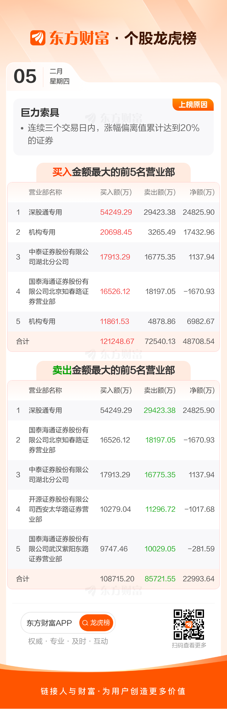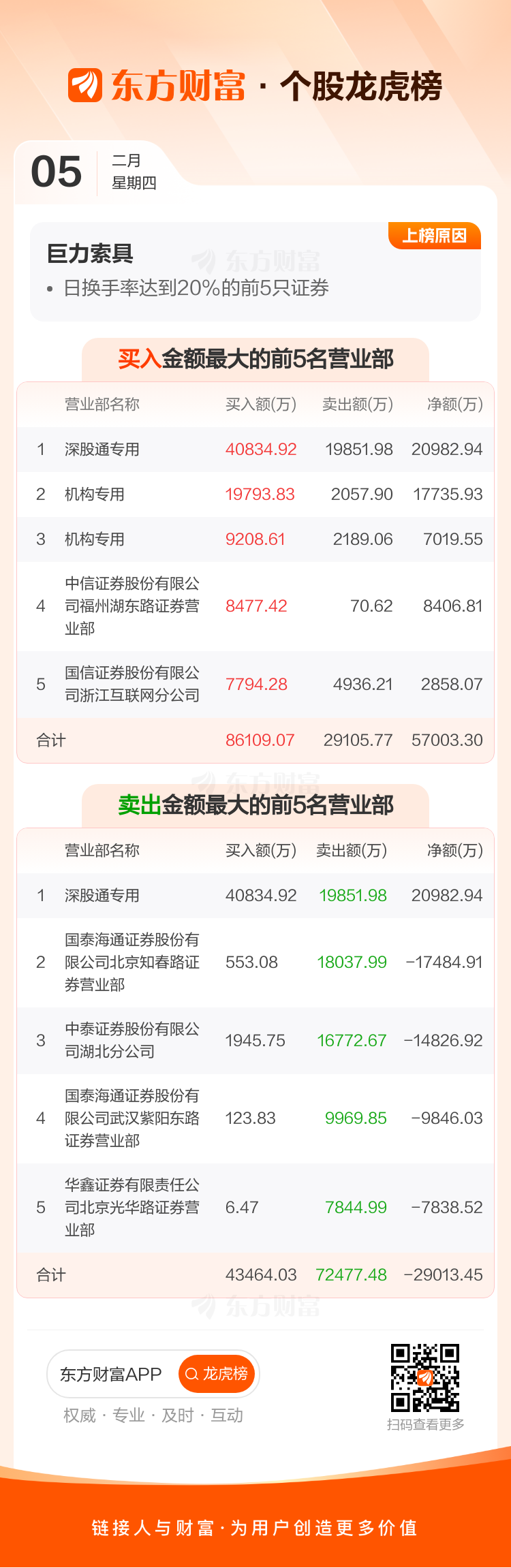 交易所2026年2月5日公布的交易公开信息显示,巨力索具因成为日换手率达到20%的前5只证券、连续三个交易日内,涨幅偏离值累计达到20%的证券上榜。巨力索具当日收报18.88元,涨跌幅7.21%,偏离值40.36%,换手率40.36%,成交额71.09亿。异常期间2月3日至2月5日,期间涨幅29.76%,累计偏离值28.41%,区间成交额114.21亿。