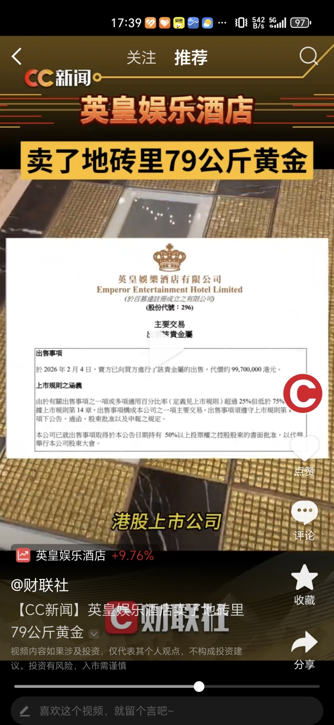 英皇可能也没想到,当初为了装门面地砖使用的黄金,如今黄金大涨给做了套利了。看来该