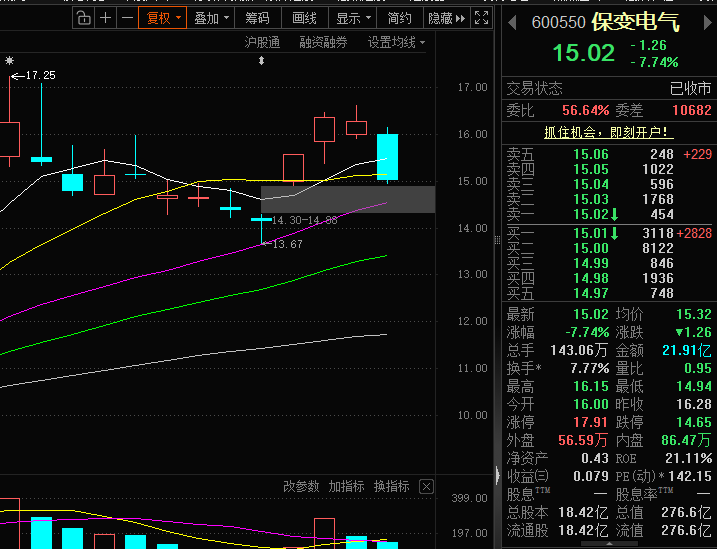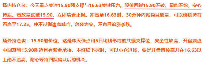 16.00低开,然后回落到15.55获得支撑,随后伴随一波反弹冲高到16.47,量能没能有效配合,随后股价再度回落。全天来看,虽然有冲高的动作,但是没能站稳16.10的关键支撑位,而且量能放大主要集中在下跌阶段,属于典型的杀跌放量,我也就没进场。