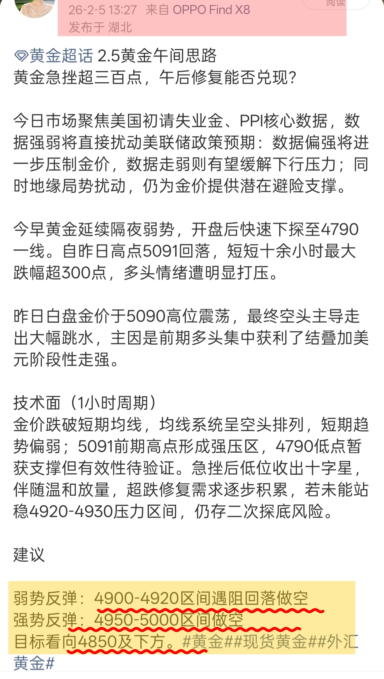 午后给出的黄金4950的箜思路,又叒来到我们的目标位4850下方了,最低4848