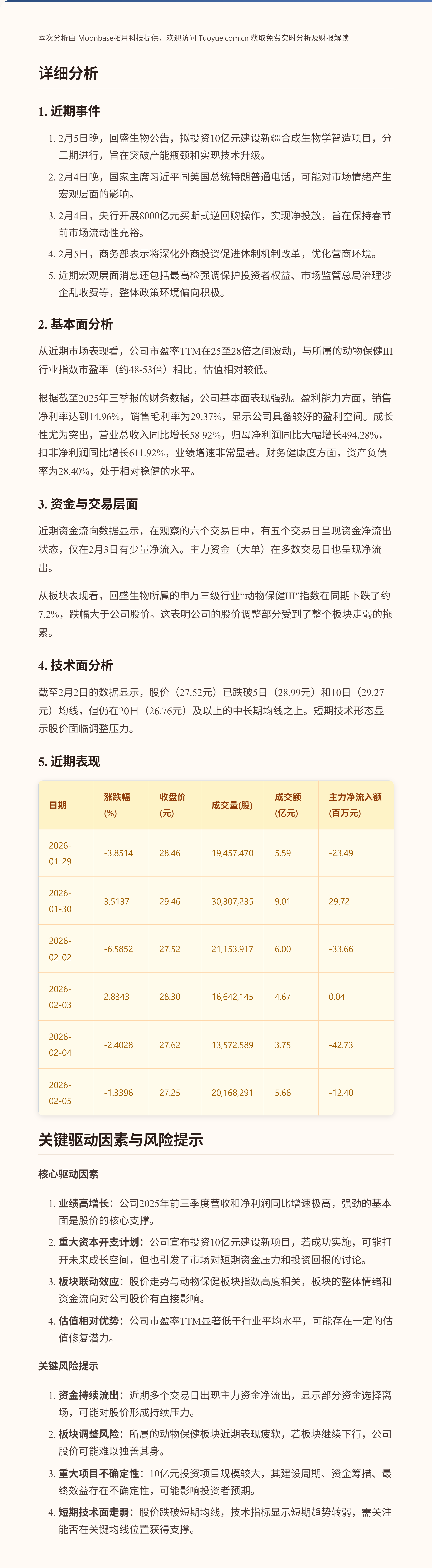 回盛生物股价在近期呈现震荡下行趋势,六个交易日累计下跌约8%。股价波动主要受到所属动物保健板块整体走弱的影响,同时公司宣布一项10亿元的重大投资项目,市场可能对此存在不同的解读。关键点在于,尽管公司基本面显示盈利能力和成长性显著改善,但短期资金流出和板块调整压力共同作用,导致股价承压。