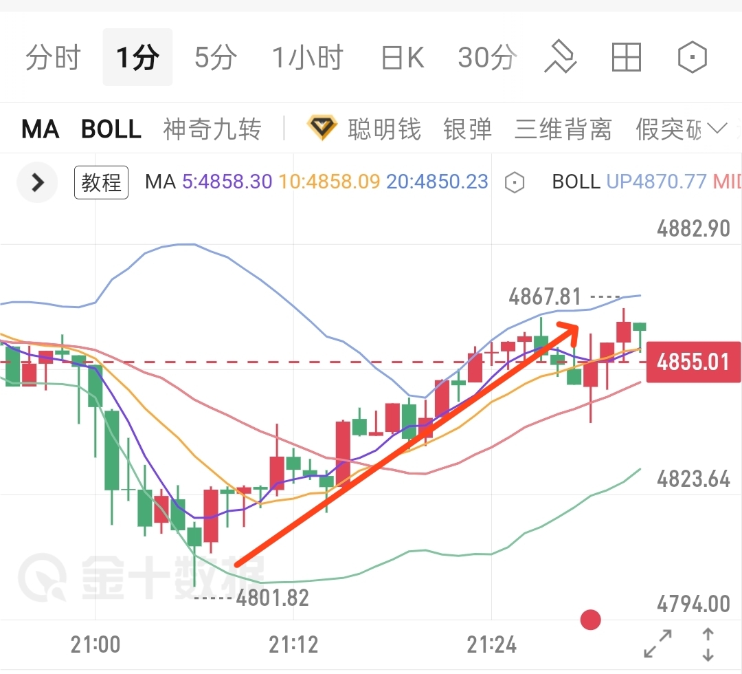 黄金晚间实盘布局,4805附近哆单,止营4850,45点空间落袋!
