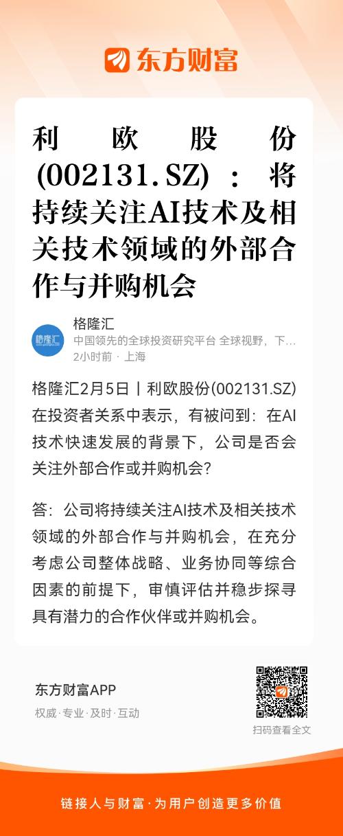格隆汇2月5日丨利欧股份(002131.SZ)在投资者关系中表示,有被问到:在AI技术快速发展的背景下,公司是否会关注外部合作或并购机会?