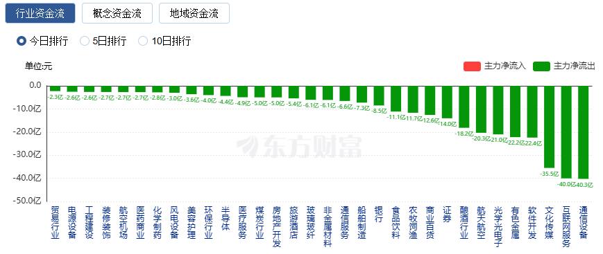 净流出方面,通信设备、互联网服务、文化传媒等净流出排名靠前,其中通信设备净流出40.25亿元。