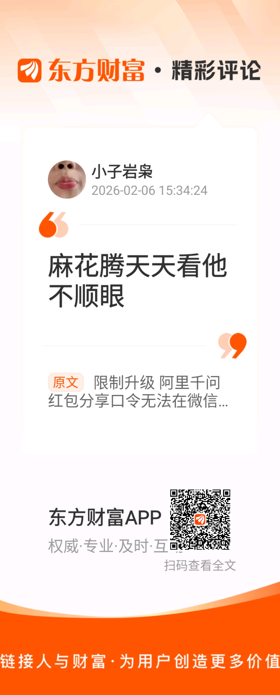 2月6日,蓝鲸科技记者实测发现,阿里千问红包最新的分享口令在微信内已失效,页面无任何复制选项,用户无法通过微信复制口令参与千问“春节30亿免单”活动。此前千问红包分享链接已被微信屏蔽,提示存在诱导分享行为。这也是继腾讯元宝后,又一被微信限制传播的AI红包活动。不过,蓝鲸科技记者发现,目前元宝红包分享口令仍可在微信内复制。