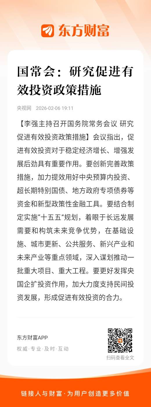 会议指出,促进有效投资对于稳定经济增长、增强发展后劲具有重要作用。要创新完善政策措施,加力提效用好中央预算内投资、超长期特别国债、地方政府专项债券等资金和新型政策性金融工具。要结合制定实施“十五五”规划,着眼于长远发展需要和构筑未来竞争优势,在基础设施、城市更新、公共服务、新兴产业和未来产业等重点领域,深入谋划推动一批重大项目、重大工程。要更好发挥央国企扩投资作用,加大力度支持民间投资发展,形成促进有效投资的合力。