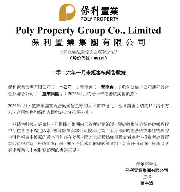 【保利置业集团:2026年1月,置业集团实现合同销售金额约人民币37亿元】保利置