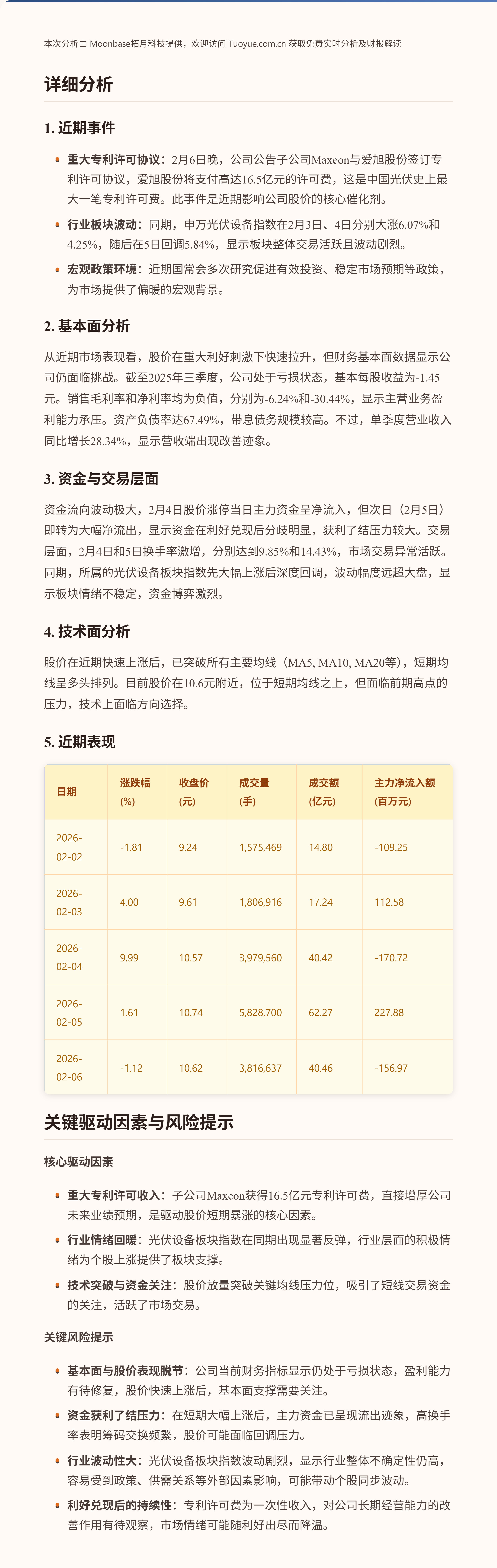 TCL中环股价在最近五个交易日内呈现先抑后扬再震荡的走势,2月4日单日涨幅接近10%是主要亮点。股价的剧烈波动与子公司Maxeon获得巨额专利许可费的重大利好事件直接相关,该消息于2月6日盘后公告,可能提前被市场部分预期。同期,光伏设备板块指数也经历了大幅上涨和回调,显示行业整体情绪波动较大。