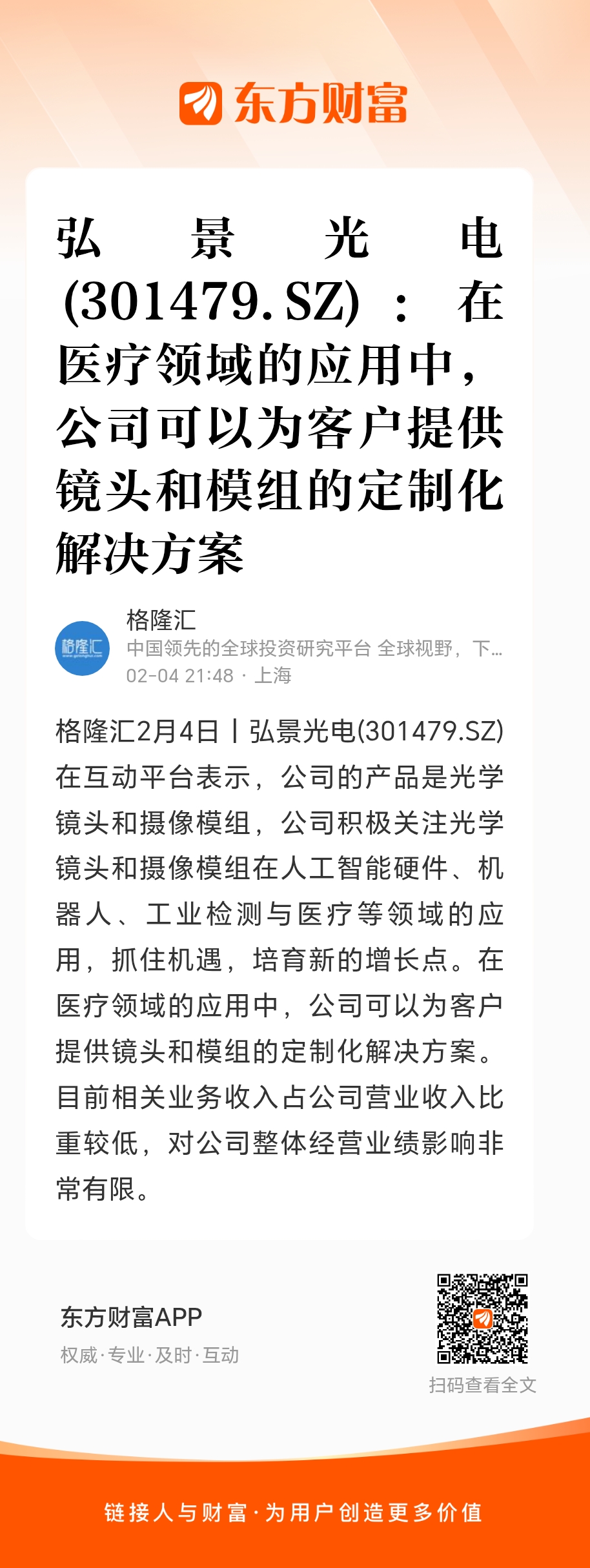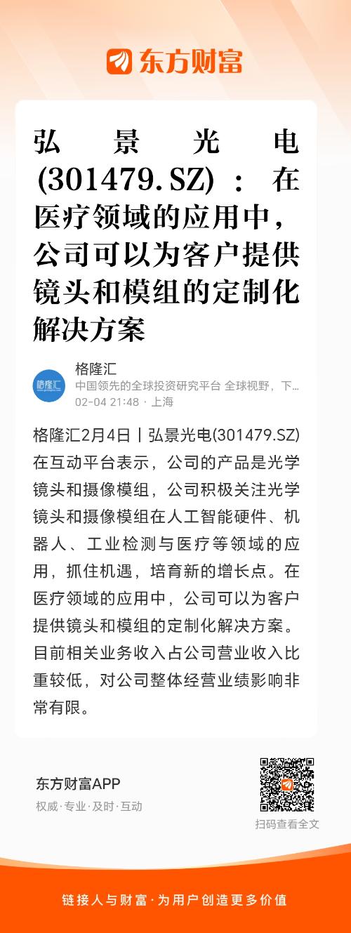 格隆汇2月4日丨弘景光电(301479.SZ)在互动平台表示,公司的产品是光学镜头和摄像模组,公司积极关注光学镜头和摄像模组在人工智能硬件、机器人、工业检测与医疗等领域的应用,抓住机遇,培育新的增长点。在医疗领域的应用中,公司可以为客户提供镜头和模组的定制化解决方案。目前相关业务收入占公司营业收入比重较低,对公司整体经营业绩影响非常有限。