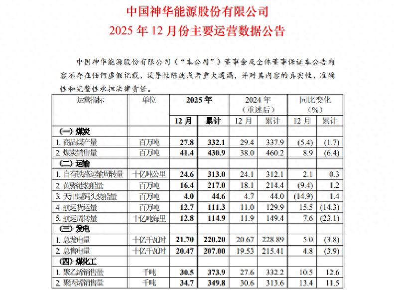 中国神华去年利润也下降了。公司预计,2025年公司净利润为495亿~545亿,同比下降7.2%~15.7%,上年度净利润为586.71亿。2025年,神华煤炭产量3.321亿吨,同比下降1.7%,煤炭销量4.309亿吨,同比下降6.4%;发电量2202亿度,同比下降3.8%,总售电量2070亿度,同比下降3.9%。