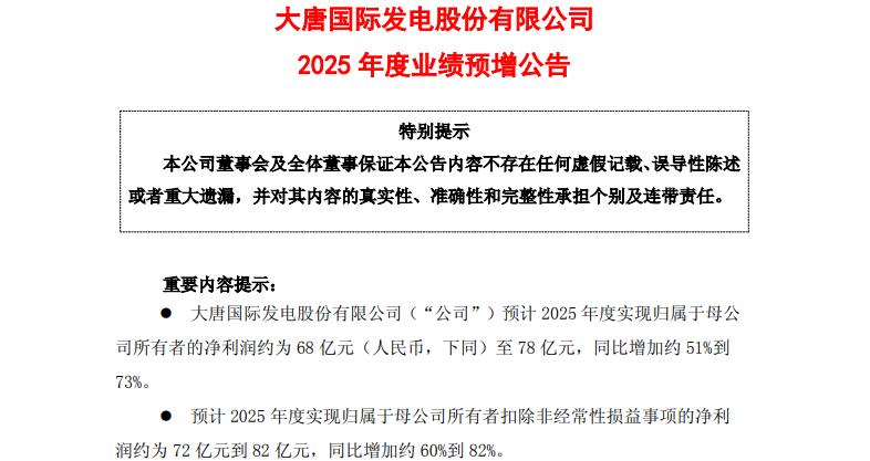 煤炭公司里面,大概有五个大公司发布了2025年业绩预告,中国神华是最大煤炭公司也是第六大发电公司,净利润也下滑了7.2%~15.7%;五大发电公司里面,大唐发电发布了业绩预告,净利润大幅增长了51%~73%。