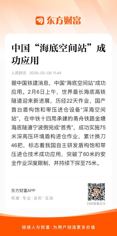 据中国铁建消息,中国“海底空间站”成功应用。2月6日上午,世界最长海底高铁隧道迎来新进展,历经22天作业,国产首台盾构饱和带压进仓设备“深海空间站”,在中铁十四局承建的甬舟铁路金塘海底隧道宁波侧完成“首秀”,成功实施75米深高压环境盾构进仓作业,累计换刀46把,标志着我国自主研发盾构饱和带压进仓技术成功应用,突破了60米的安全作业深度限制,并持续下探至75米。