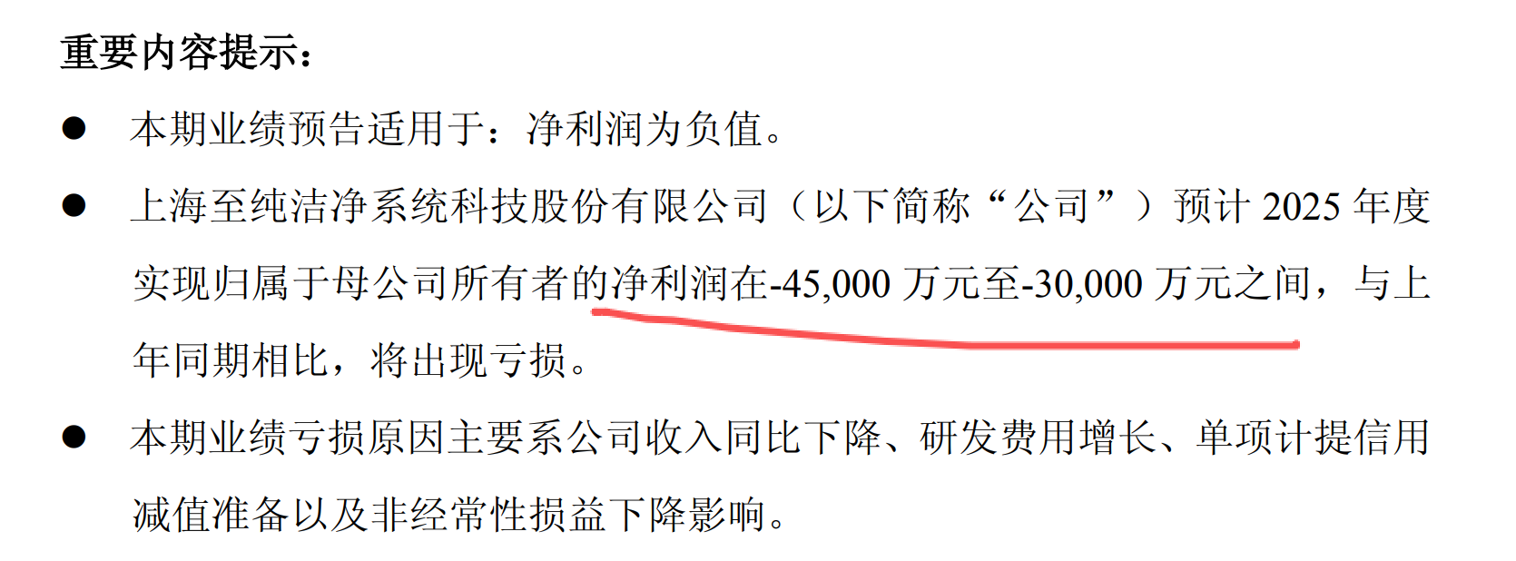 至纯科技,这个股票2025年亏损了3亿到4.5亿元。