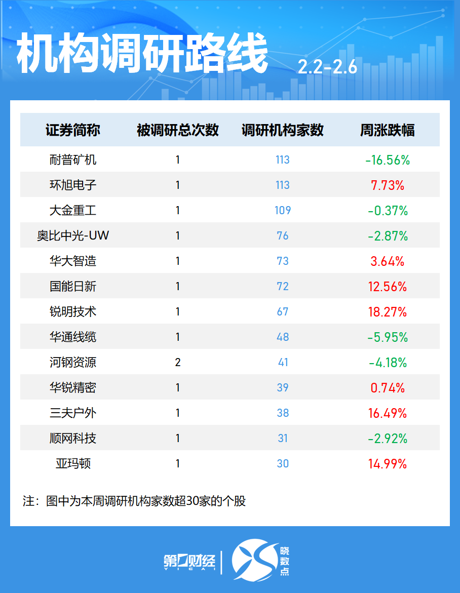 Wind数据显示,机构本周(2月2日至2月6日)共调研了129家上市公司,其中耐普矿机、环旭电子最获关注,参与调研的机构为113家。大金重工、奥比中光-UW、华大智造分别获109家、76家、73家机构调研。
