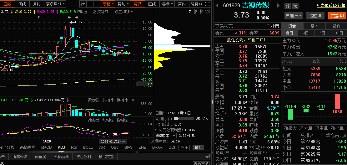 吉视传媒昨天中规中矩,收盘3.73,不涨不跌(0.0%),主力资金净流出4903万,股价又回到了3.73这个关键位。量能依旧偏弱,和三维通信一样,也是缩量回调,没有出现恐慌抛售,目前还在震荡修复阶段,短期均线缠绕在一起,不算差,就是太磨人。