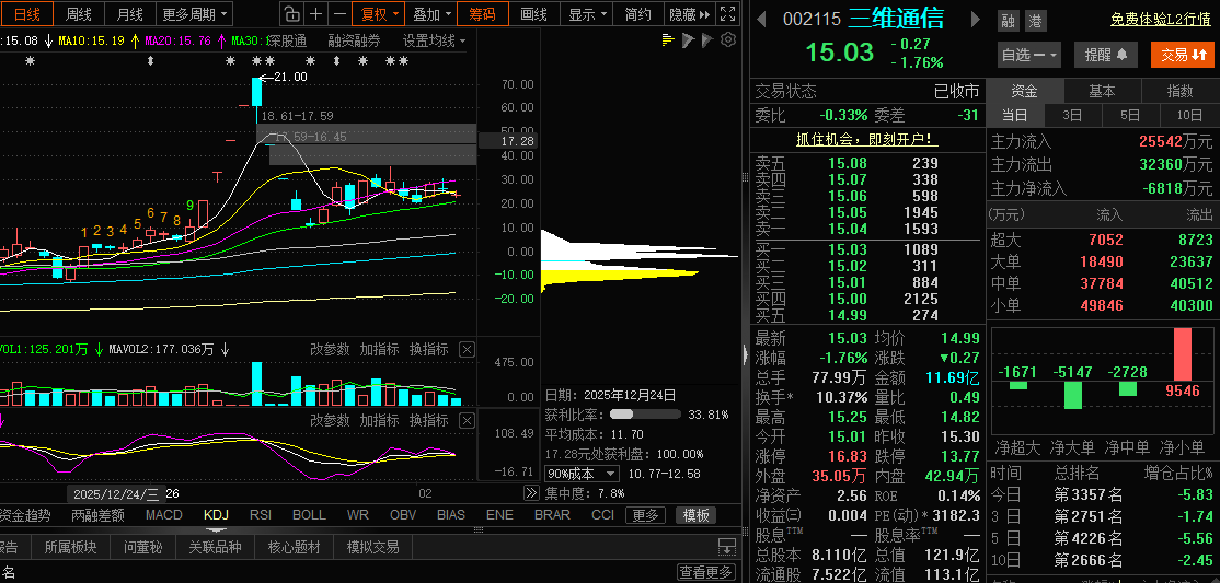 三维通信昨天表现:有点小疲软,收盘15.03,跌了1.76%,主力资金净流出9105万,反弹后又跌回15.5以下,但大家别慌,这是好事!