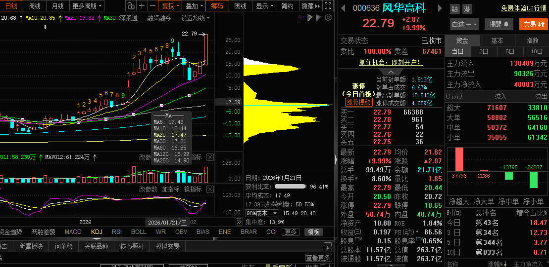 风华高科昨天的表现:2月5日直接涨停(涨9.99%),收报22.79, 换手率8.60%,成交额21.71亿,量能不算特别大,但足够支撑涨停,而且是稳稳封板没开,说明资金认可度不低。
