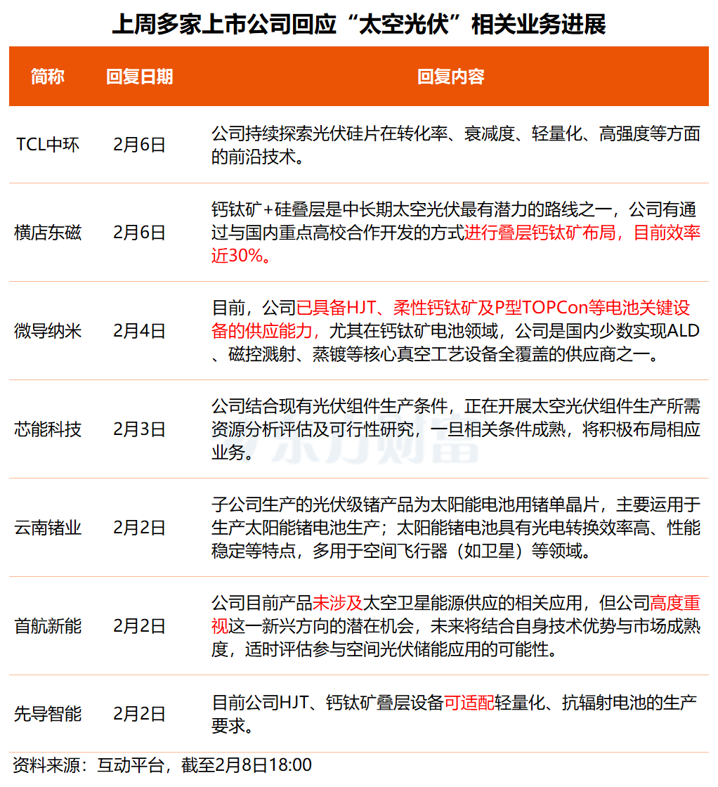横店东磁上周五在互动平台上表示,钙钛矿+硅叠层是中长期太空光伏最有潜力的路线之一,公司有通过与国内重点高校合作开发的方式进行叠层钙钛矿布局,目前效率近30%。公司同时提到:“未接触马斯克的太空光伏考察团队。”