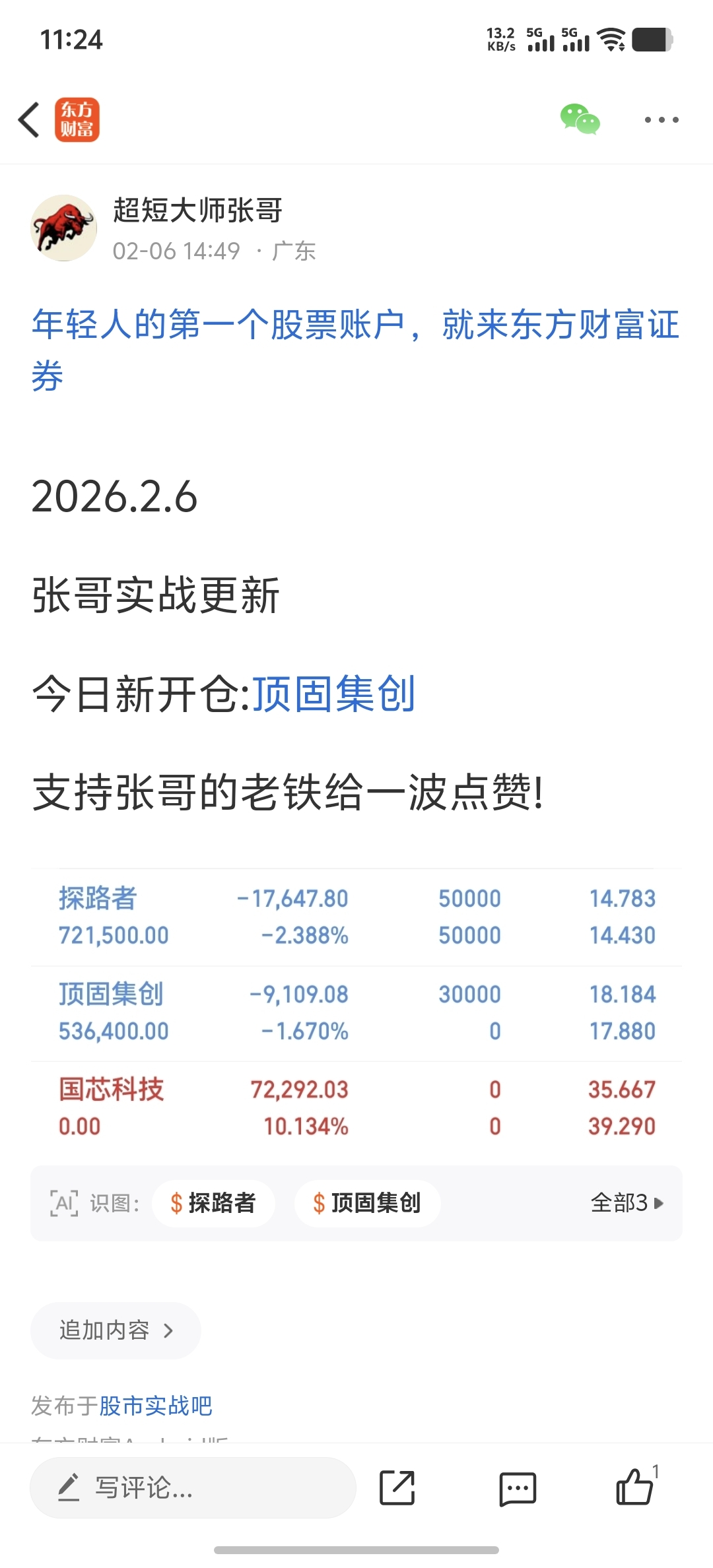 张哥上周五进的:顶固集创 有没有实力,跟上发财的粉丝朋友一起点赞!