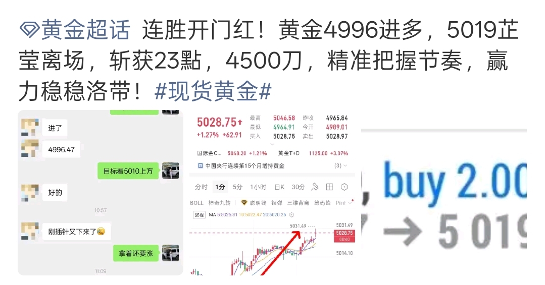 连胜开门红!黄金4996进多,5019芷莹离场,斩获23点,4500刀,精准把握