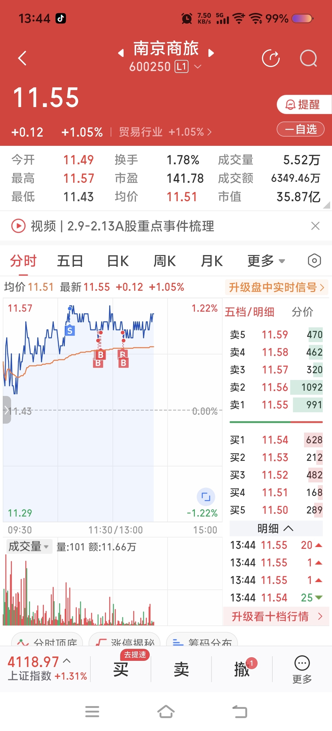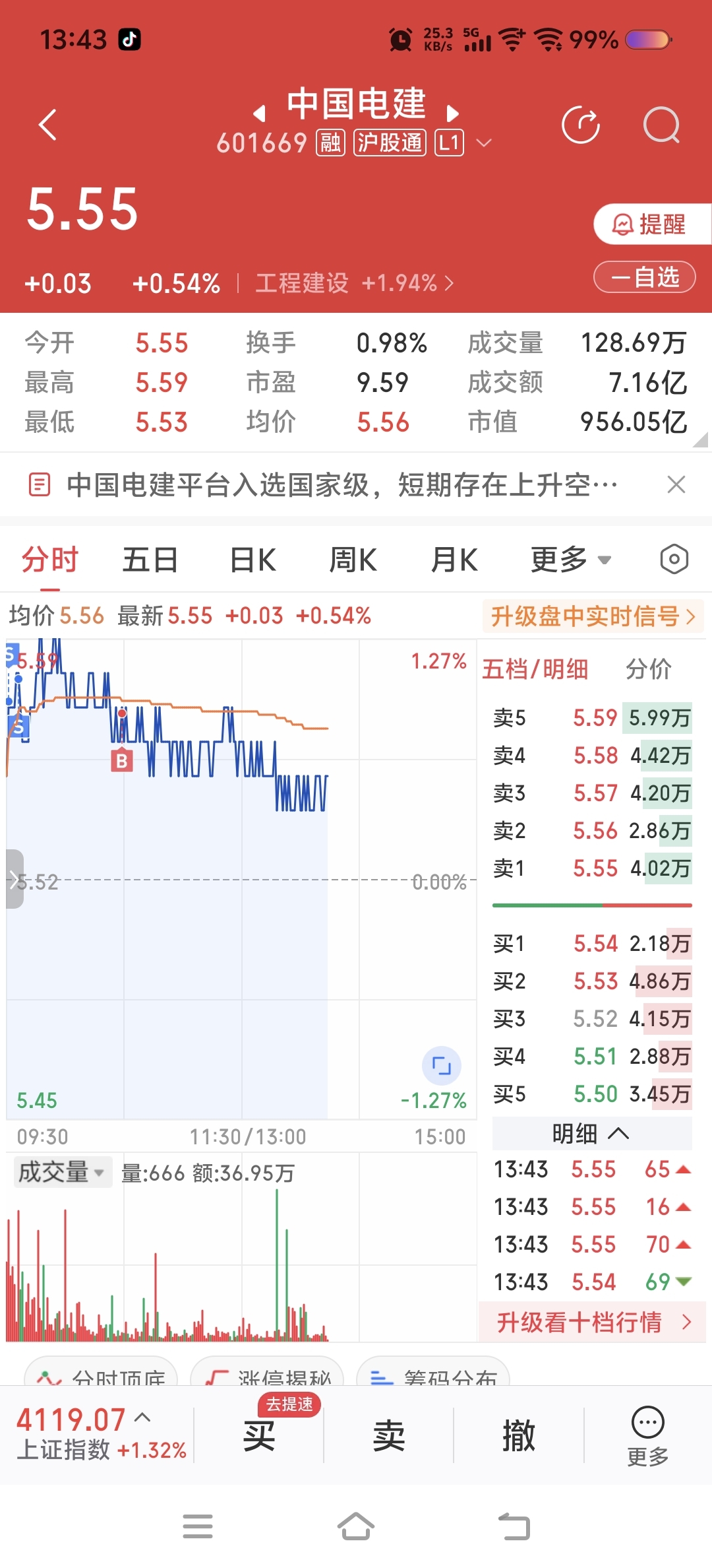 海兰信上周五收市前加仓1.5w股,今天上午冲高做T,仍保持2w股底仓。预判它短线应该还有新高。中国电建,南京商旅盘中继续做T
