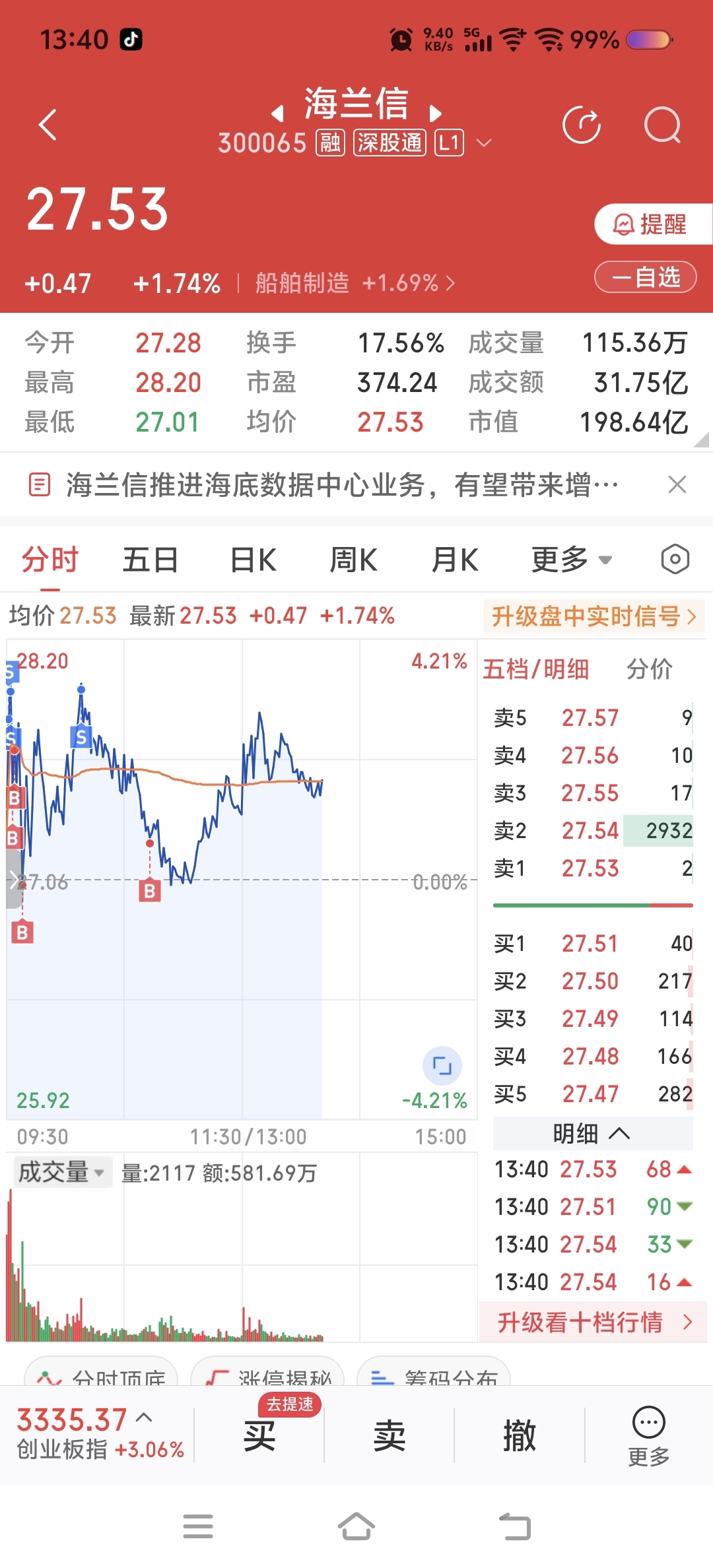 海兰信上周五收市前加仓1.5w股,今天上午冲高做T,仍保持2w股底仓。预判它短线