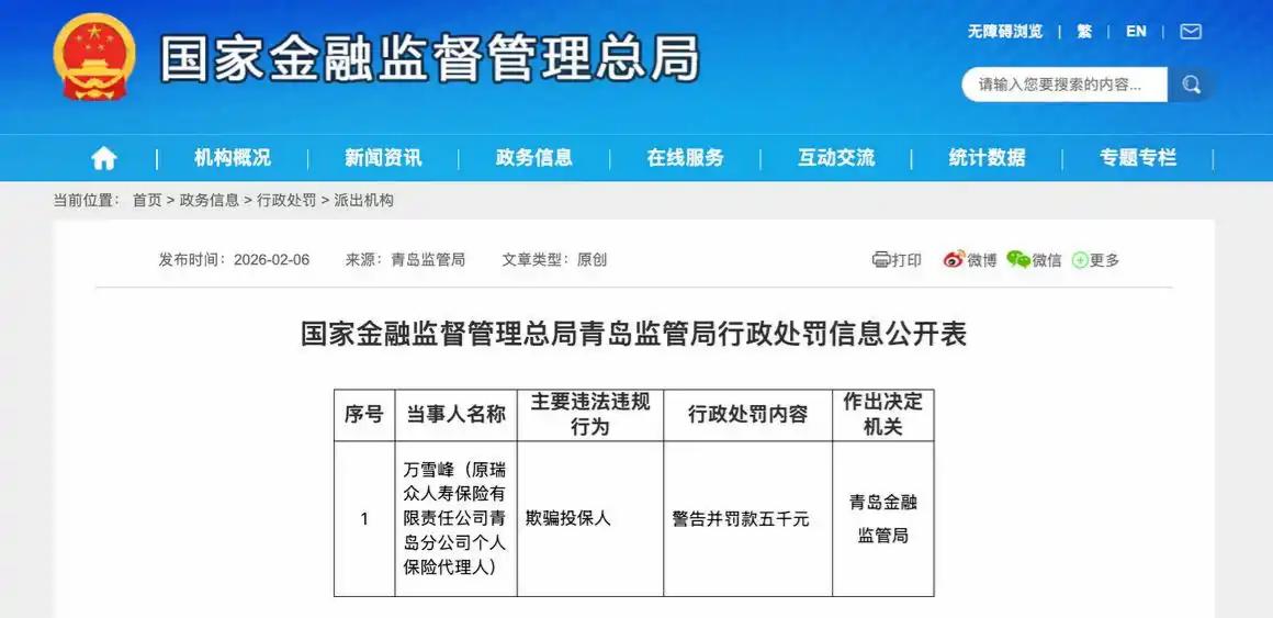 【因欺骗投保人,原瑞众人寿青岛分公司一代理人被罚】2月6日,国家金融监督管理总局