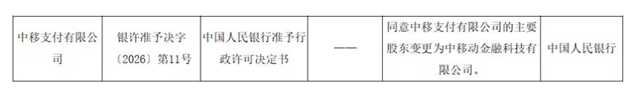 【中移支付主要股东获批变更】据人民银行官网更新的非银行支付机构重大事项变更许可信
