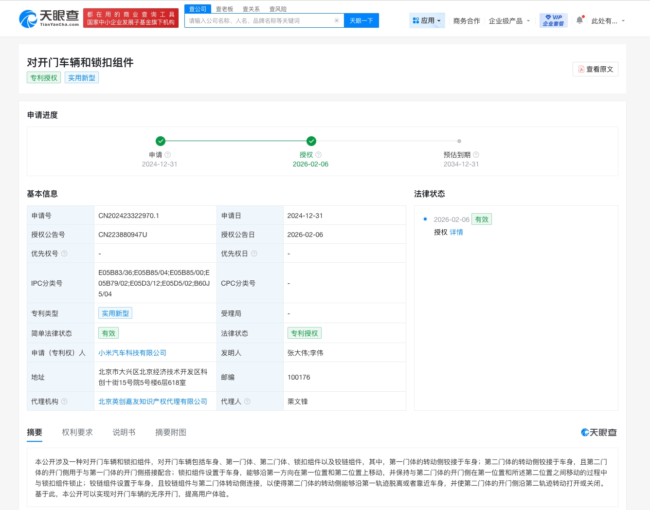 南方财经2月9日电,天眼查知识产权信息显示,近日,小米汽车科技有限公司申请的“对开门车辆和锁扣组件”专利获授权。摘要显示,本公开的对开门车辆包括车身、第一门体、第二门体、锁扣组件以及铰链组件,其中,第一门体的转动侧铰接于车身;第二门体的转动侧铰接于车身,且第二门体的开门侧用于与第一门体的开门侧搭接配合;锁扣组件设置于车身,能够沿第一方向在第一位置和第二位置上移动,并保持与第二门体的开门侧在第一位置和所述第二位置之间移动的过程中与锁扣组件锁止;铰链组件设置于车身,且铰链组件与第二门体转动侧连接,以使得第二门体的转动侧能够沿第一轨迹脱离或者靠近车身,并使第二门体的开门侧沿第二轨迹转动打开或关闭。基于此,本公开可以实现对开门车辆的无序开门,提高用户体验。