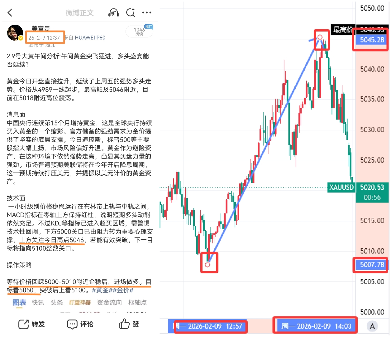 富贵午间提示的大黄5000-5010做多区间,航晴最低触及5007,精准踩中进场