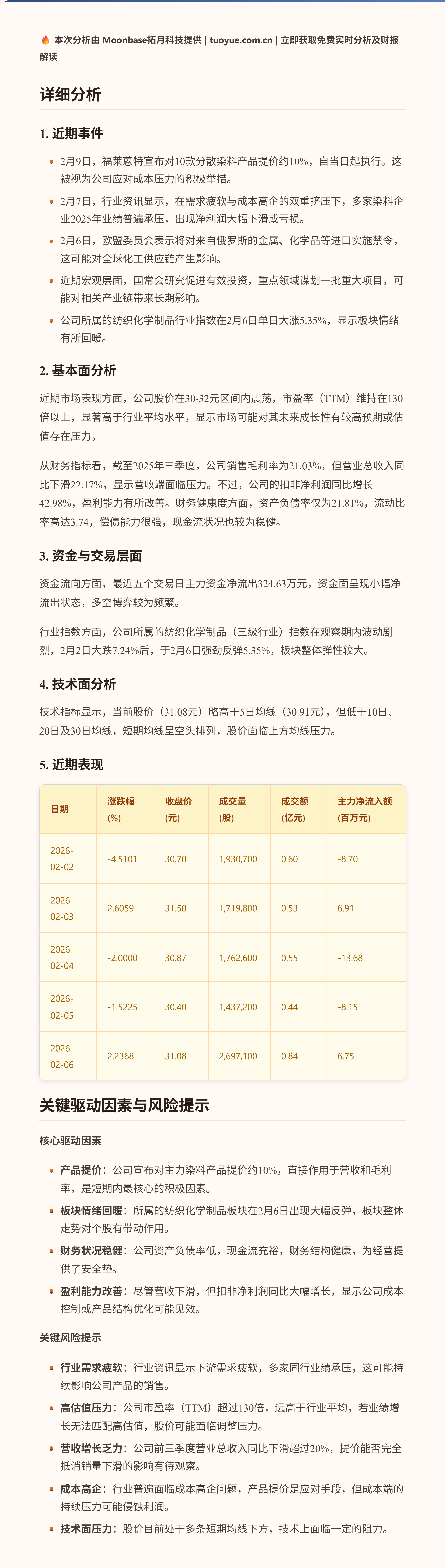 福莱蒽特股价在最近五个交易日内呈现震荡走势,主要受到行业整体波动及公司自身产品提价消息的影响。关键亮点在于公司于2月9日宣布对10款分散染料产品提价约10%,这可能有助于改善其盈利前景。同时,近期数据显示公司估值水平较高,且行业面临需求疲软与成本高企的压力。