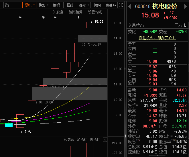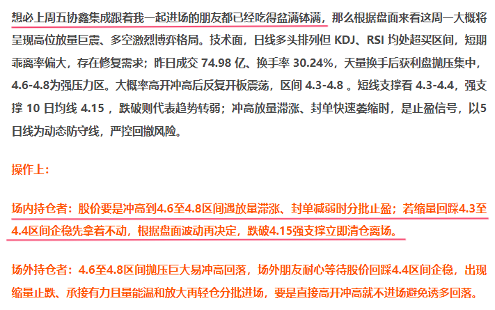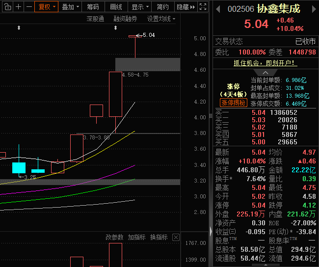 今日开盘直接高开在5.02,已经完全跳过了预期4.6-4.8区间压力位,盘中仅短暂回落到4.75的位置,随后买盘强力承接实现V型反转并封板涨停,没有出现放量滞涨、封单减弱的现象,我也就拿着不动。再次恭喜周五和我一起上车的朋友大口吃肉,节前红包稳稳到手!