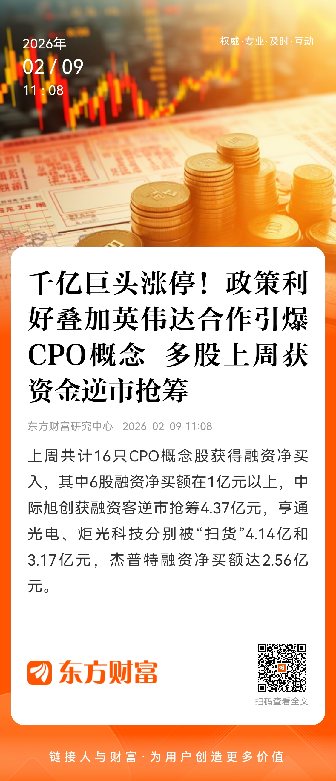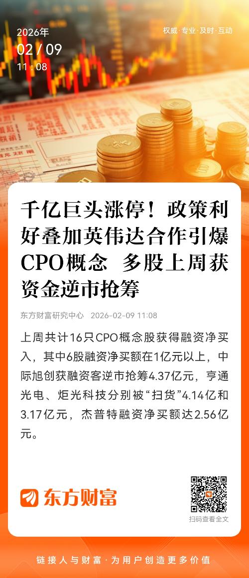 东方财富Choice数据显示,上周共计16只CPO概念股获得融资净买入,其中6股融资净买额在1亿元以上,中际旭创获融资客逆市抢筹4.37亿元,亨通光电、炬光科技分别被“扫货”4.14亿和3.17亿元,杰普特融资净买额达2.56亿元。