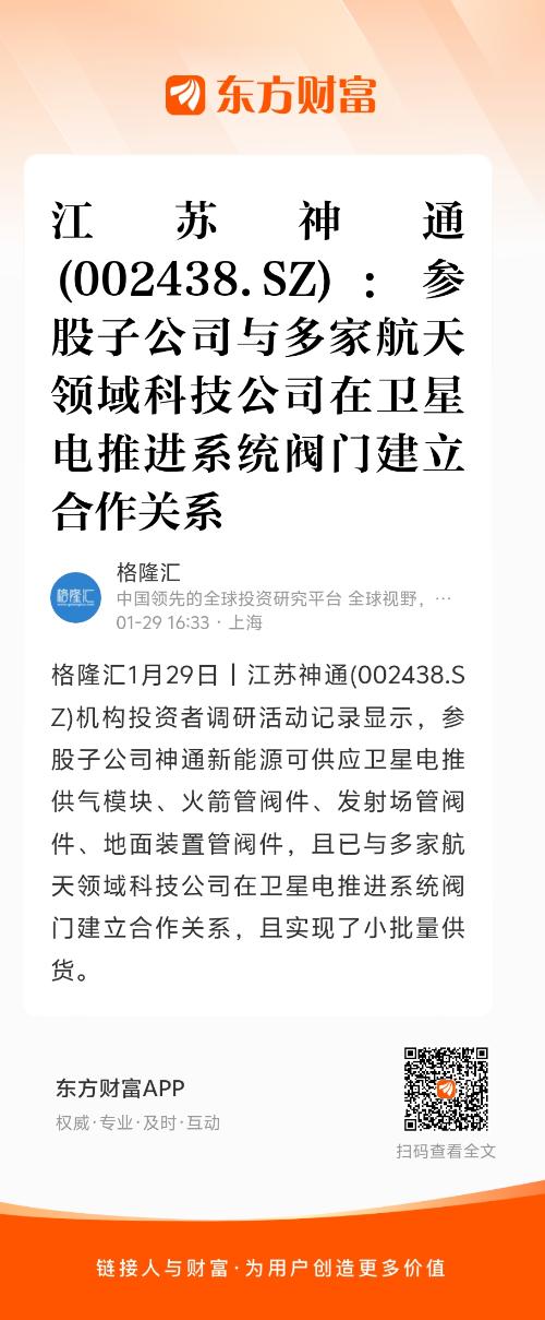 格隆汇1月29日丨江苏神通(002438.SZ)机构投资者调研活动记录显示,参股子公司神通新能源可供应卫星电推供气模块、火箭管阀件、发射场管阀件、地面装置管阀件,且已与多家航天领域科技公司在卫星电推进系统阀门建立合作关系,且实现了小批量供货。