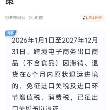 一、对自2026年1月1日至2027年12月31日期间在跨境电子商务海关监管代码(1210、9610、9710、9810)项下申报出口,因滞销、退货原因,自出口之日起6个月内原状退运进境的商品(不含食品),免征进口关税和进口环节增值税、消费税;出口时已征收的出口关税准予退还,出口时已征收的增值税、消费税参照内销货物发生退货有关税收规定执行。其中,监管代码1210项下出口商品,应自海关特殊监管区域或保税物流中心(B型)出区离境之日起6个月内退运至境内区外。