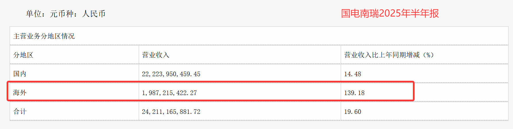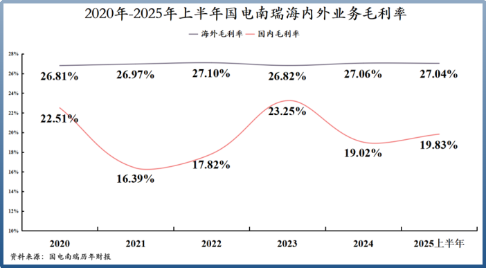 国内市场一直是国电南瑞的基本盘,宛如一棵大树深深扎根的肥沃土壤,为公司的发展提供了源源不断的养分。2025 年上半年,公司在国内市场实现营收 222.24 亿元 ,同比增长 14.5%,展现出稳健的增长态势。更为亮眼的是,国内业务的毛利率达到了 27.04% ,这一数据不仅体现了公司在国内市场深厚的竞争优势,也为公司带来了丰厚的利润回报。