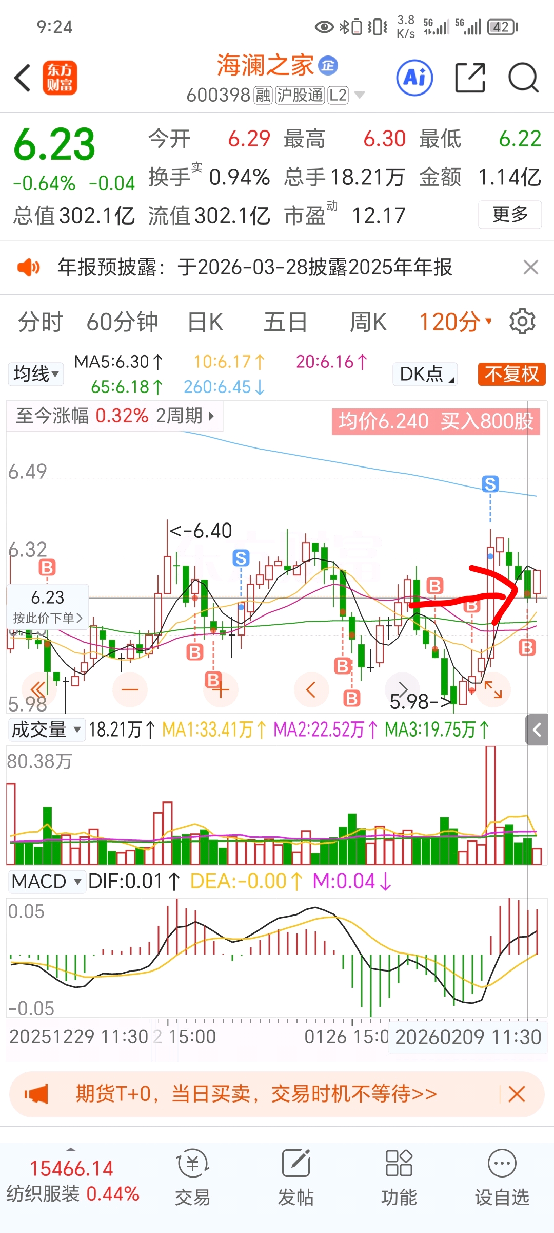 1.2月5号 放量6.65亿大涨,收一根大阳线。上影线短。以120分钟线为基础看,下跌的三根K线,第一根在放量下跌,第二根就开始缩量。第三根我在买的时候量是小于第二根的。所以我认为这是在洗盘。建仓。