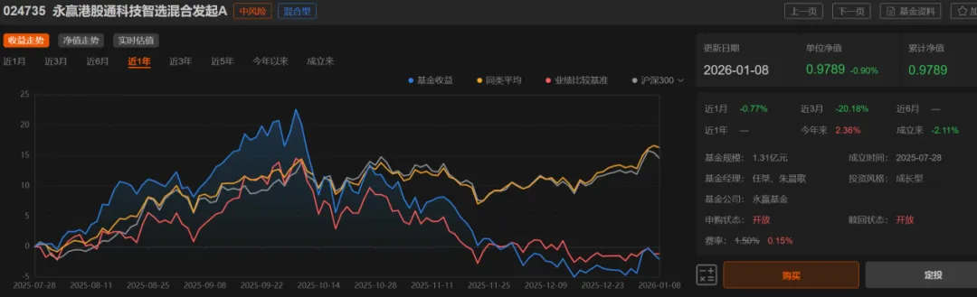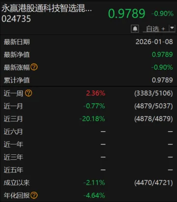 但翻开任桀管理的另一只产品——永赢港股通科技智选,画风却截然不同。该产品是任桀在去年发的唯一新品,成立近半年,其净值波动相当剧烈:由最高的1.2264元跌至最低的0.9502元,最大回撤接近23%。截至1月9日,其最新净值为0.995元,累计收益率仍为负。