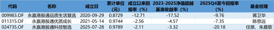 事实上,不止于任桀,永赢基金其它港股主动股基也都未能跑出长期收益。据东财Choice数据,截至1月8日,永赢基金旗下共有3只投向港股的主动权益类产品,除永赢港股通科技智选外,还有永赢港股通品质生活慧选、永赢港股通优质成长,三只产品自成立以来的净值回报全部为亏损,且2023年-2025年三年区间,相对业绩基准的收益也全部为负。