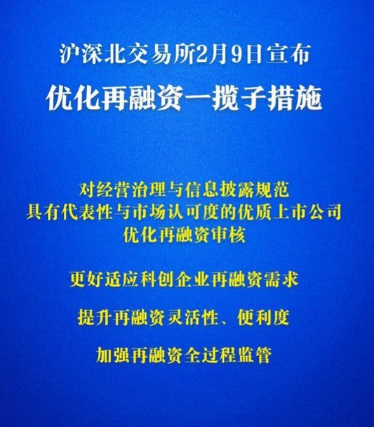 2月9日,沪深北三大交易所联手宣布,优化上市公司再融资的一揽子措施。简单说,就是对上市公司“伸手要钱”这件事,做了一次精细化的“交通疏导”。
