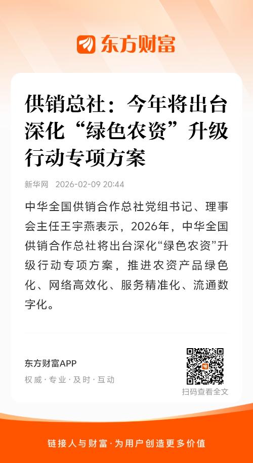 中华全国供销合作总社党组书记、理事会主任王宇燕表示,2026年,中华全国供销合作总社将出台深化“绿色农资”升级行动专项方案,推进农资产品绿色化、网络高效化、服务精准化、流通数字化。
