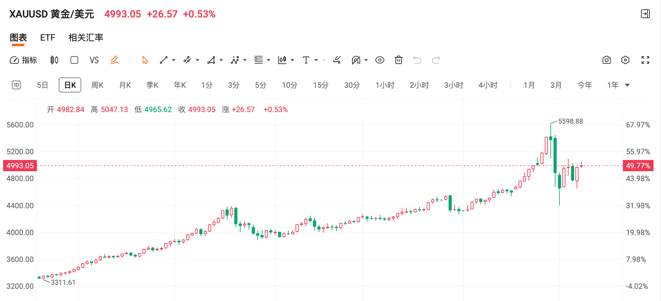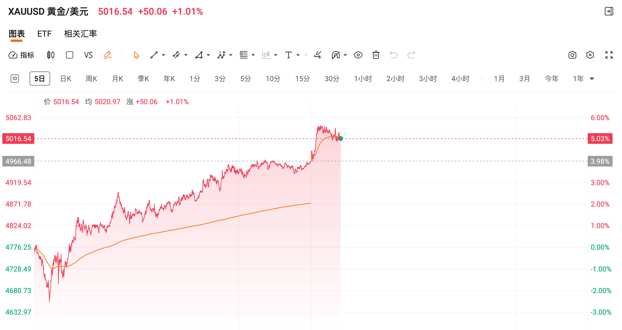 黄金白银自周五亚洲早盘一路修复,截止目前黄金现货重新突破5000美元整数关口,白银期货今早突破80美元