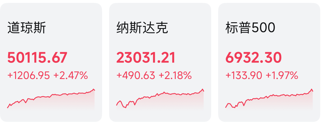 纳斯达克综合指数收涨2.18%,标普500指数收涨1.97%,道琼斯指数收涨2.47%,正式突破5万点大关