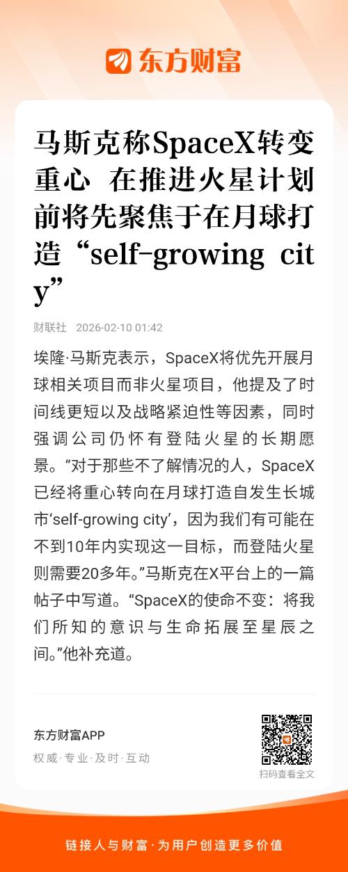 埃隆·马斯克表示,SpaceX将优先开展月球相关项目而非火星项目,他提及了时间线更短以及战略紧迫性等因素,同时强调公司仍怀有登陆火星的长期愿景。“对于那些不了解情况的人,SpaceX已经将重心转向在月球打造自发生长城市‘self-growing city’,因为我们有可能在不到10年内实现这一目标,而登陆火星则需要20多年。”马斯克在X平台上的一篇帖子中写道。“SpaceX的使命不变:将我们所知的意识与生命拓展至星辰之间。”他补充道。