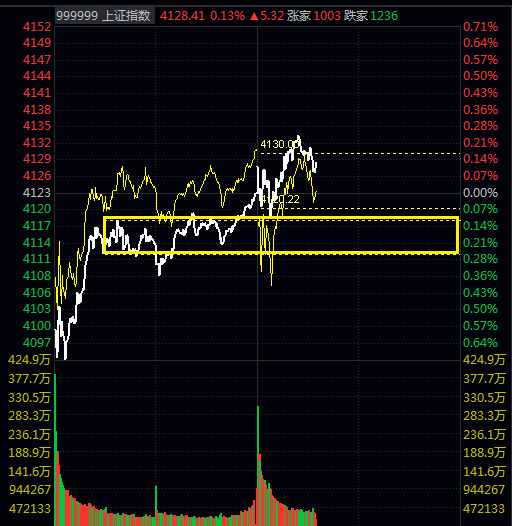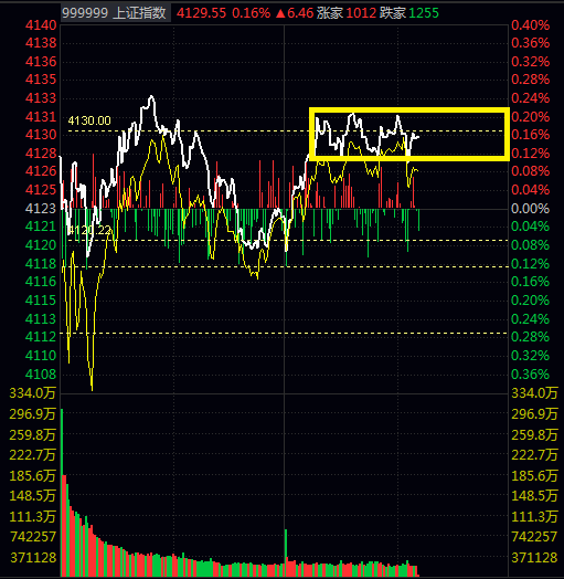 指数昨天和今天分时图,很清晰看到目前指数在昨天横盘三个多小时的箱体上方运行,目前先假设昨天震荡区是支撑