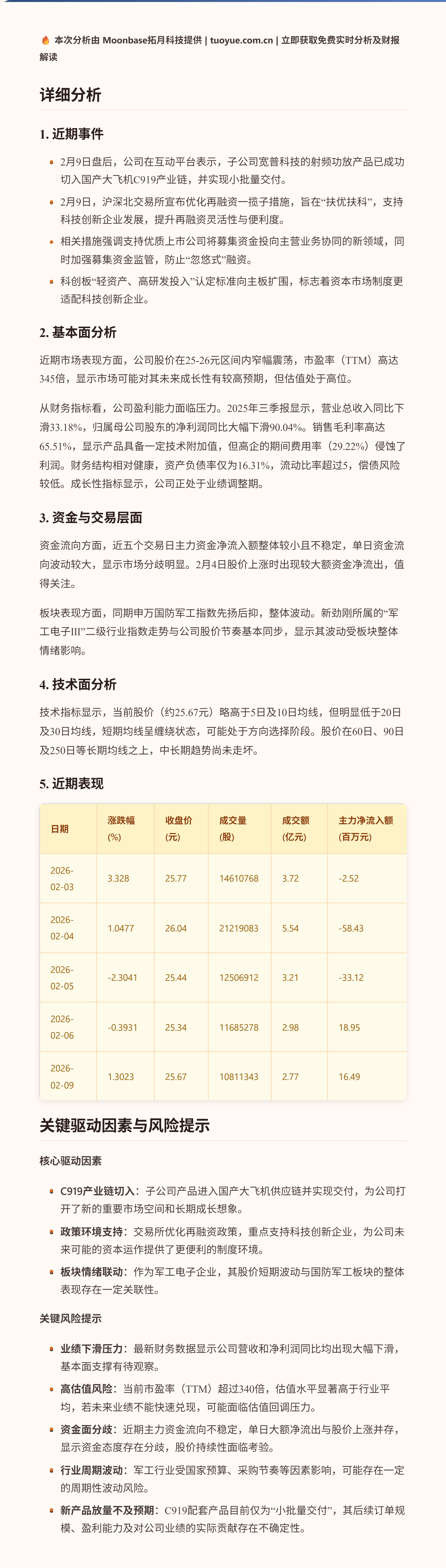 新劲刚股价在最近五个交易日内呈现震荡走势,累计小幅上涨。2月3日的大幅上涨可能与市场对军工板块的关注有关,而2月9日盘后发布的关于子公司产品切入C919产业链的利好消息,可能为后续股价表现提供了潜在支撑。当前公司估值水平较高,且近期财务数据显示营收与利润同比出现下滑。